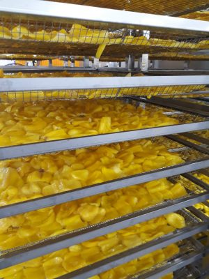 Conventionally, drying is carried out with hot air. At our factory, we apply heat-pump drying technology. Aside from the drying chamber, this system is equipped with one or two mechanical refrigerators depending on the capacity. The refrigerators serve to reduce the temperature of the air coming out of the drying chamber and the water vapor is condensed into liquid water which is then removed. The air then becomes drier.  It is blown back into the drying chamber and because it is drier it can take moisture from the food faster without the need to heat it up to a very high temperature. This technology is called low-temperature drying. The process is also shorter. Because of those facts the product preserves better the nutrients and sensorial quality including the taste, the color, and the flavor.